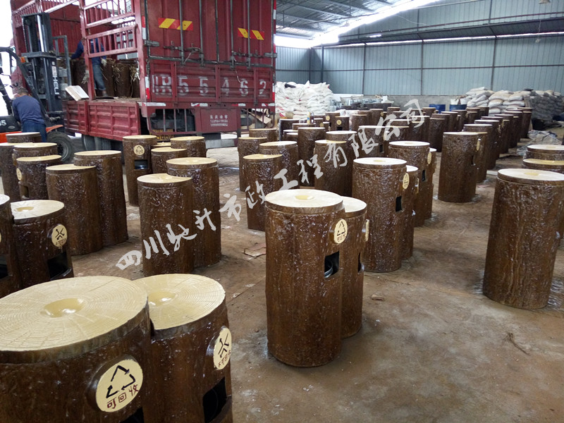 2016年10月,我司承接的貴州省六盤水市盤縣景區仿樹皮雙桶垃圾桶已生產完畢發貨。