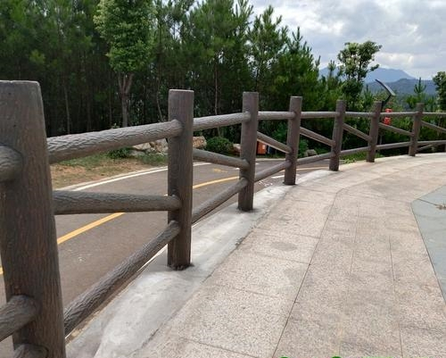 仿樹皮欄桿是以水泥混凝土為主材料,表面塑造實木紋理。具有色澤、紋理逼真、堅固耐用、免維護、自然美觀等優點,其防腐性、耐水、耐燃、耐候性、抗壓力遠遠超過自然木材,與自然生態環境搭配非常和諧,裝飾性強。